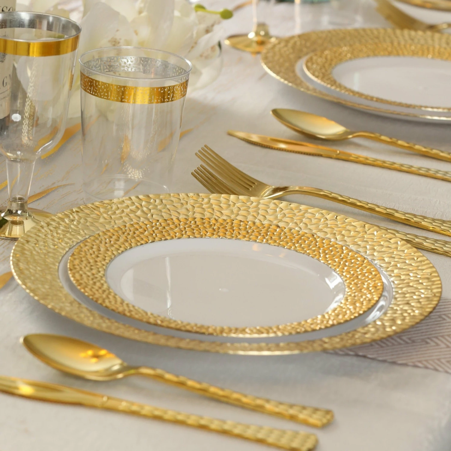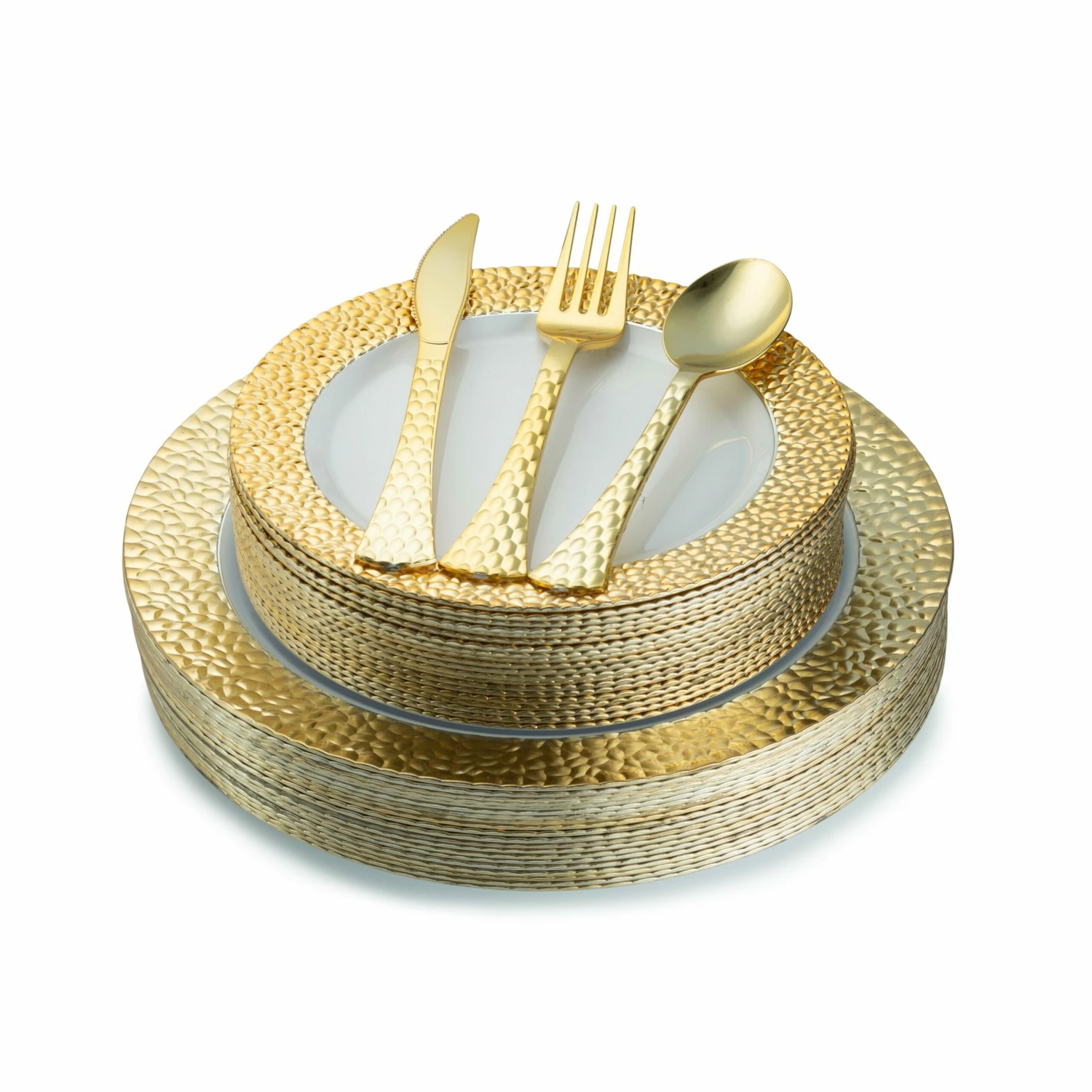 This 100-piece set by Posh Setting is it. With its elegantΒ white andΒ gold design, itβs great for any event or special occasion. This 100-pieceΒ white and goldΒ plastic plates and plastic silverware set, will enhance your wedding table,Β familyΒ dinner,Β holiday party,Β babyΒ shower or any special event.
