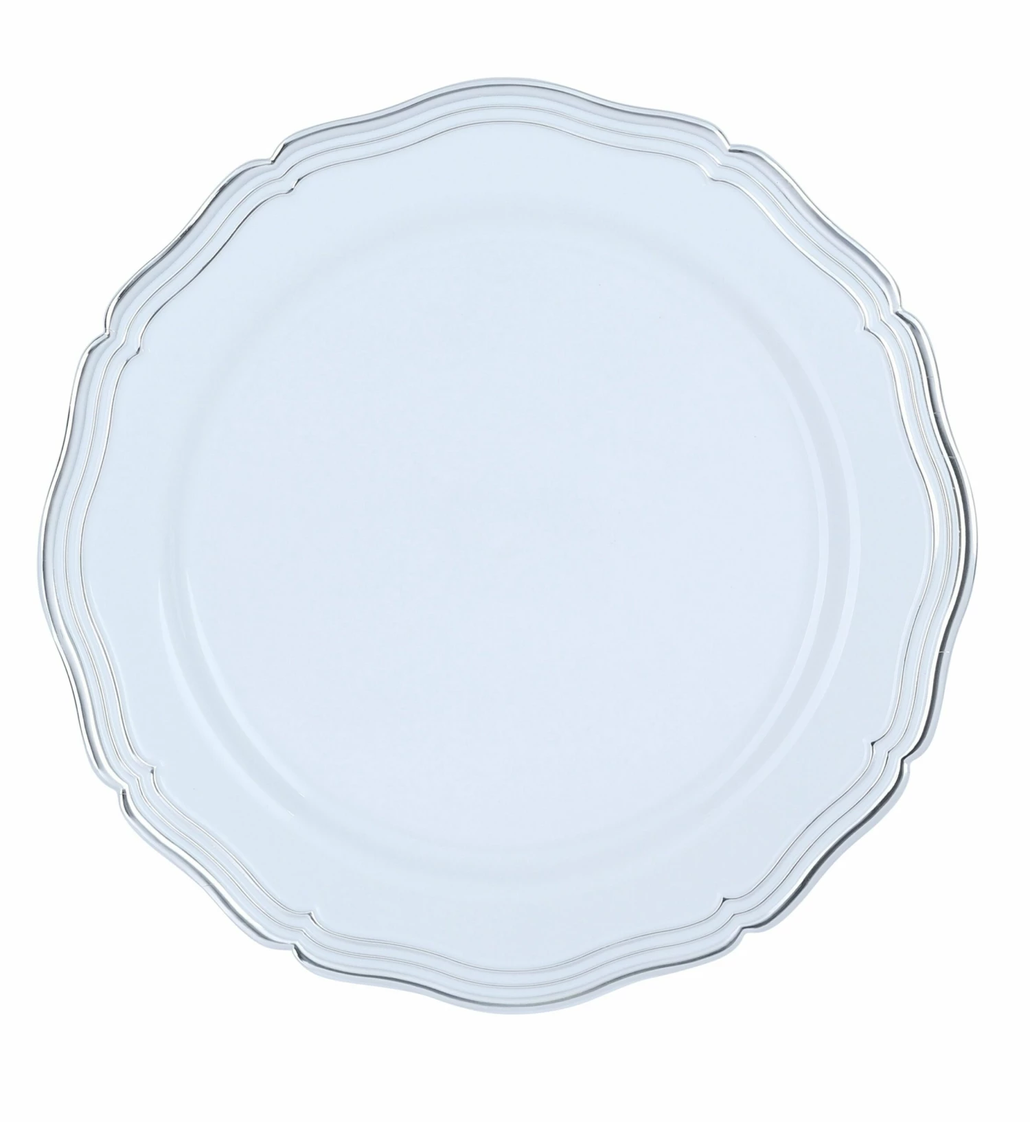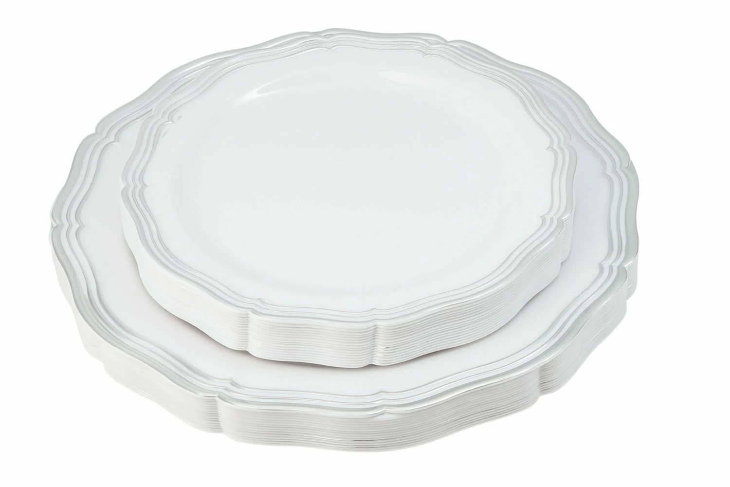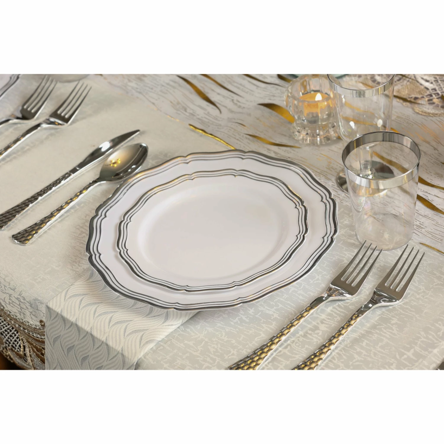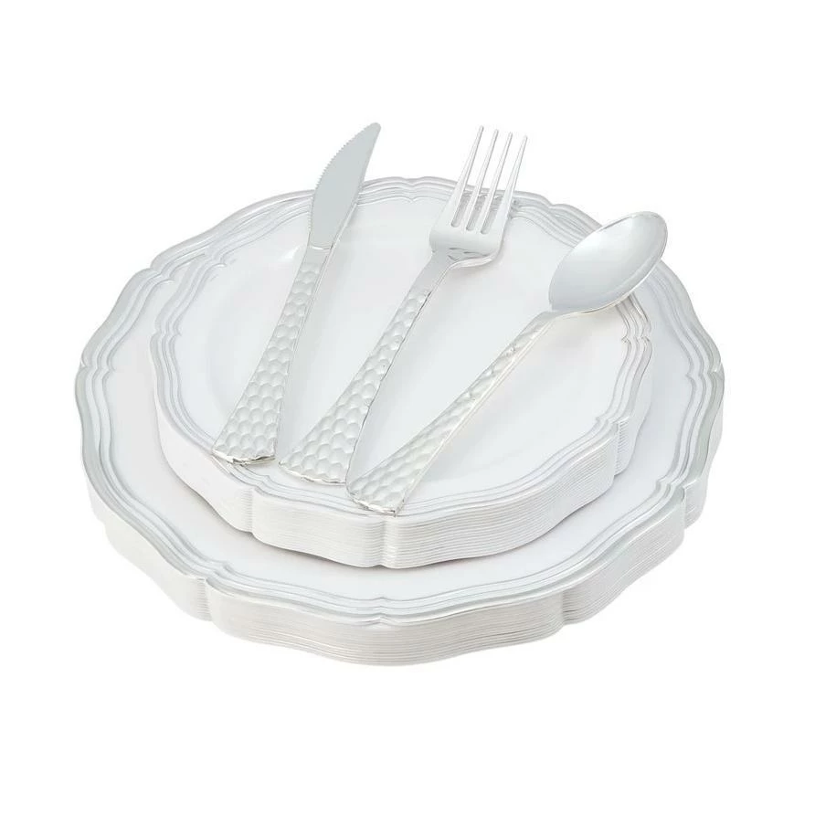 This 100-piece set by Posh Setting is it. With its elegant White andΒ Silver Design, itβs great for any event or special occasion. This 100-piece plastic plates and plastic silverware set, will enhance your wedding table, Family Dinner, Holiday party, Baby Shower or any special event.