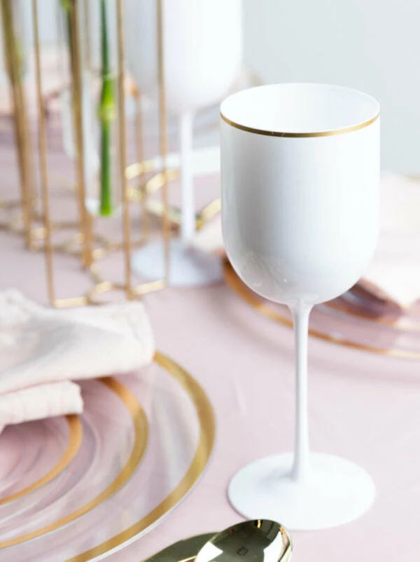 Clean and white/Gold Rimmed stemmed drinkware for some bright height on your table.