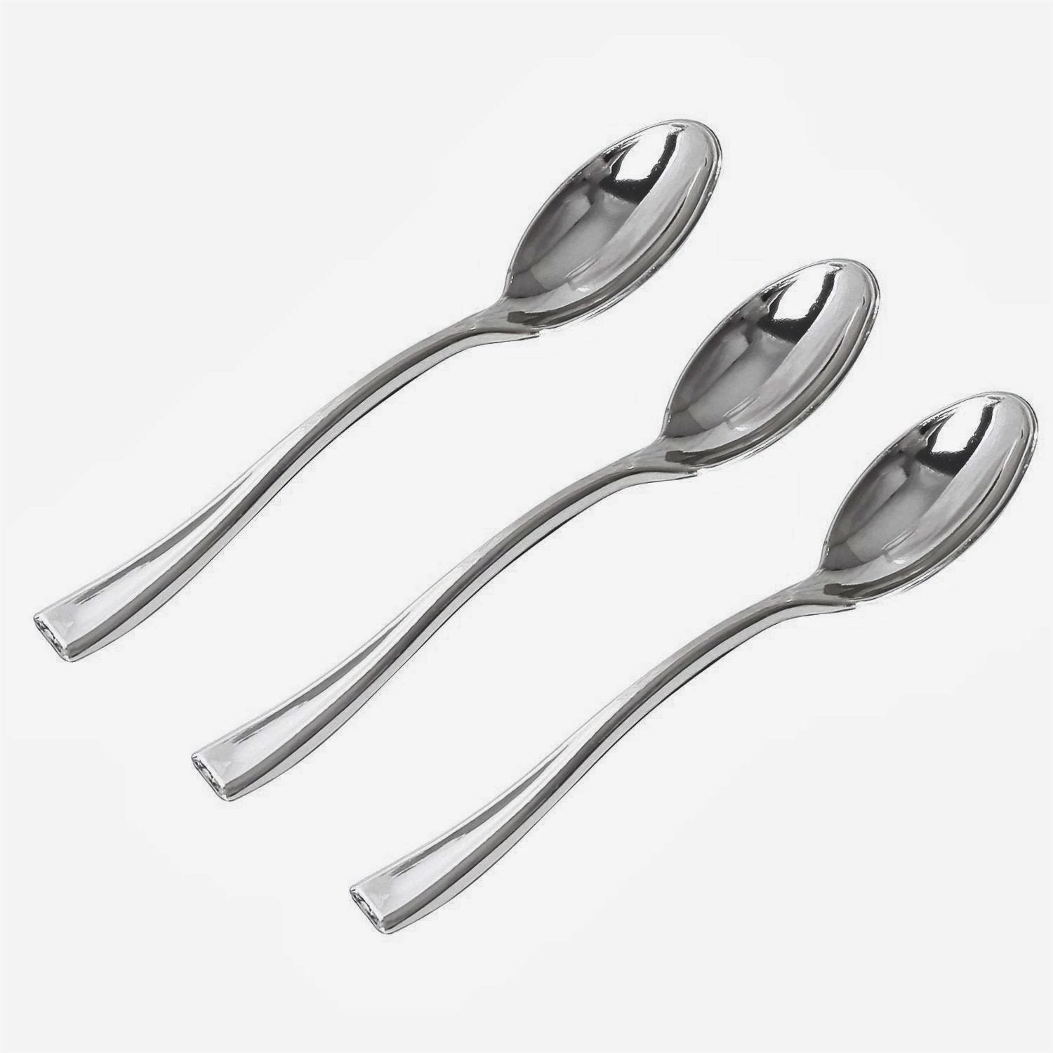 Our 72 count silver disposable mini spoons are crafted from high grade, non-toxic BPA free high gloss plastic. That ensures that these mini silver spoons are durable enough to wash and reuse or simply dispose of for easy clean up.