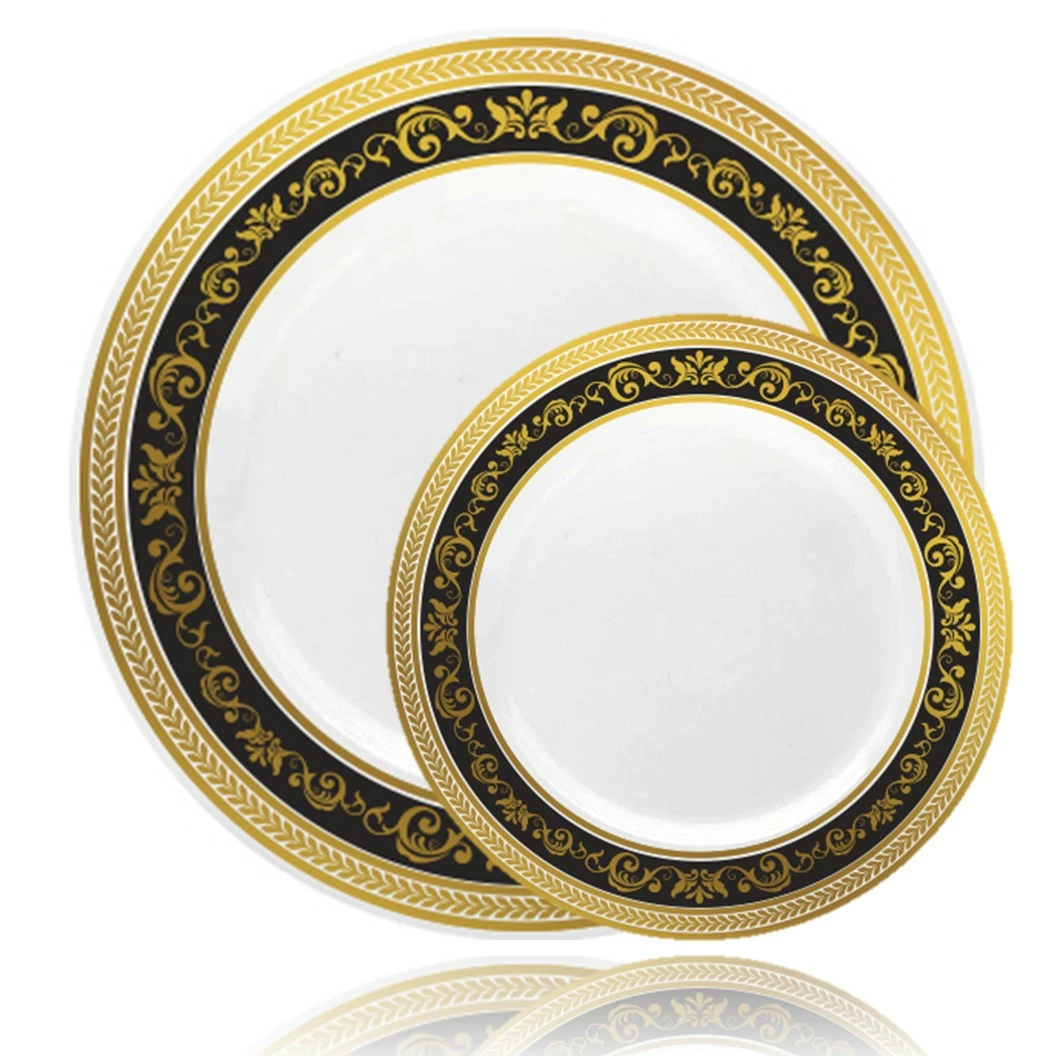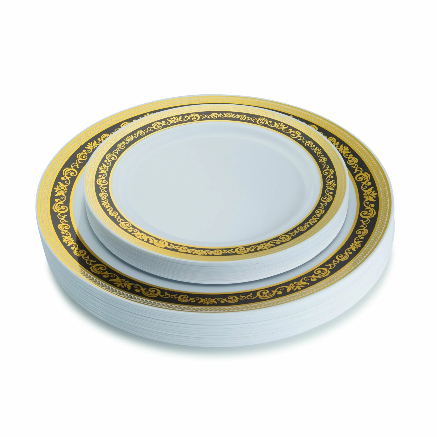 Hosting a party? Enhance your event, party or special occasion with elegant dinnerware. Change the look of your table and awe your guests with these elegant and stylishΒ white and goldΒ plastic plates.Β Β These round, plastic plates with itsΒ black andΒ gold designed border gives your event an elegant touch without distracting from the main event. Best of all, they have a real china look appearance.