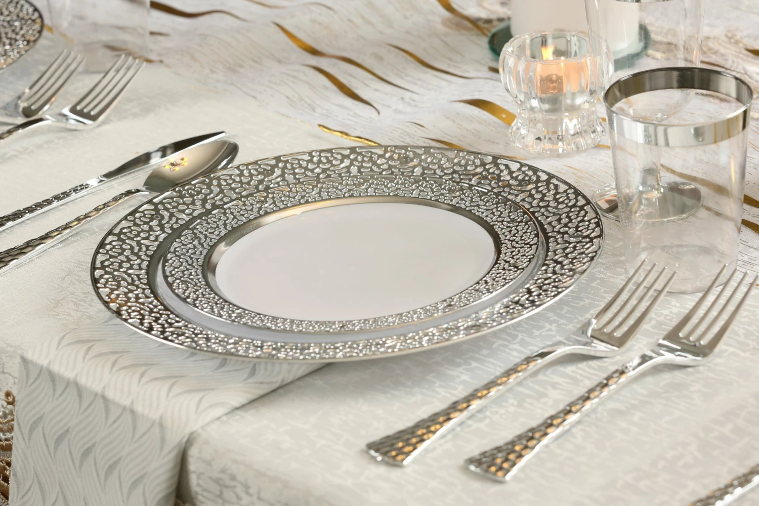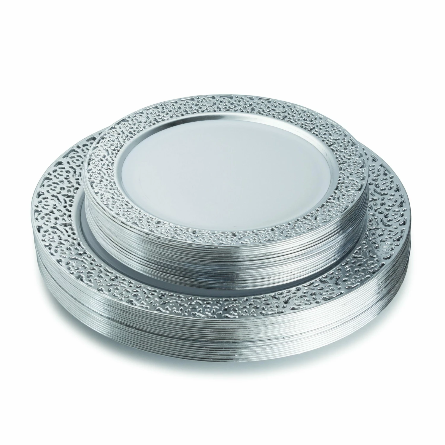 Hosting a party? Enhance your event, party or special occasion with elegant dinnerware. Change the look of your table and awe your guests with these elegant and stylishΒ white andΒ silver plastic plates.Β Β These round, plastic plates with its lace style andΒ silver designed border gives your event an elegant touch without distracting from the main event. Best of all, they have a real china look appearance.