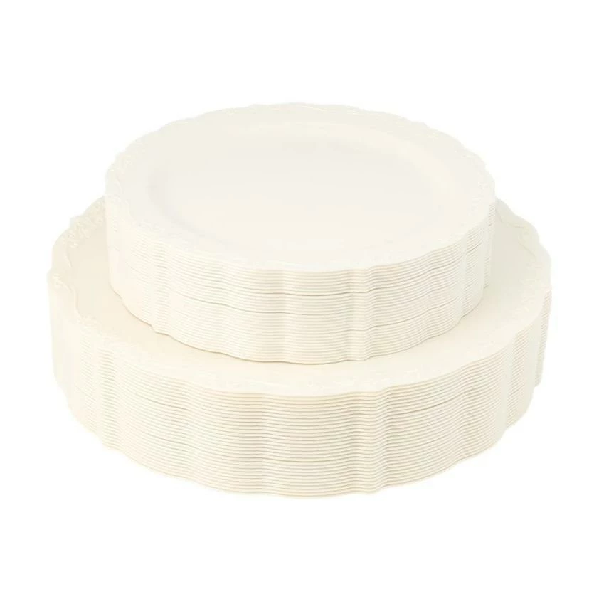 The quality of the plates at your party or event play a major factor in how a guest views both you and the event. Being that theseΒ creamΒ embossed rimmed plates are durable and extra pretty, your guests will appreciate that you care about the small details. That’s why we offer these super sturdy and durable eco-friendlyΒ plastic plates.
