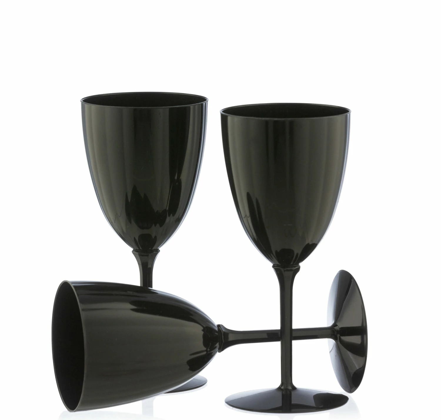 Add elegance to your party with these practical and pretty plastic wine goblets.Β A must-have for the frequent party hostess! Use it as wine cups, champagne cups, cocktail cups, juice cups, dessert cups and more. Ideal for bridal showers, engagement parties, bars, nightclubs, weddings, receptions, picnics, catered events and all occasions.