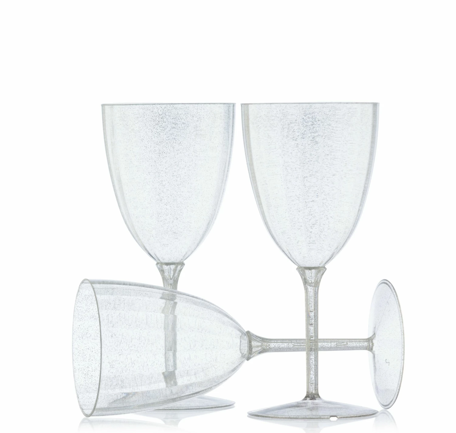 Add elegance to your party with these practical and pretty plastic wine goblets.Β A must-have for the frequent party hostess! Use it as wine cups, champagne cups, cocktail cups, juice cups, dessert cups and more. Ideal for bridal showers, engagement parties, bars, nightclubs, weddings, receptions, picnics, catered events and all occasions.