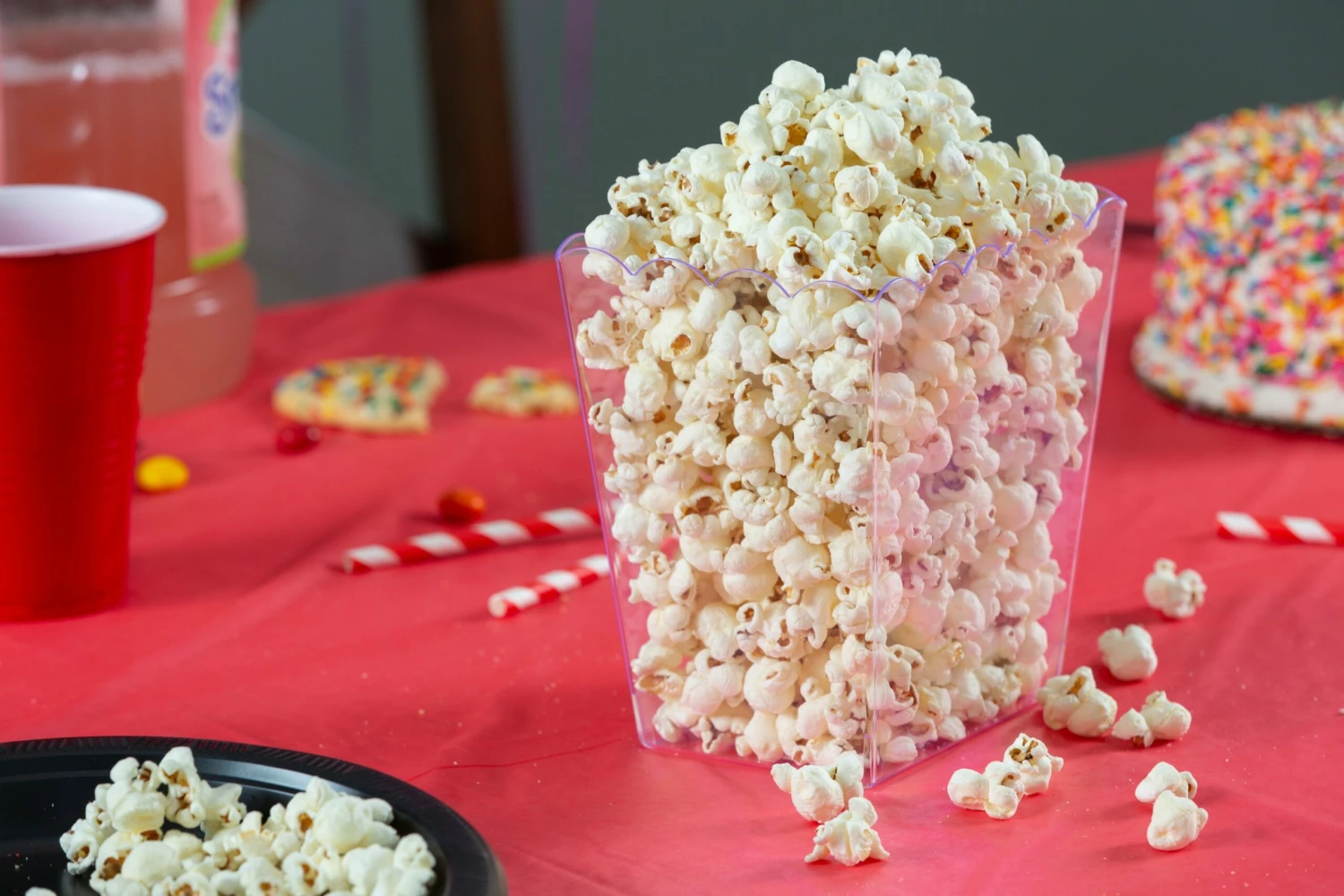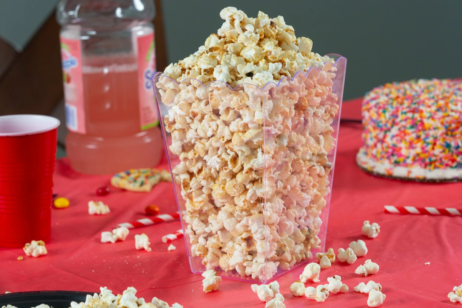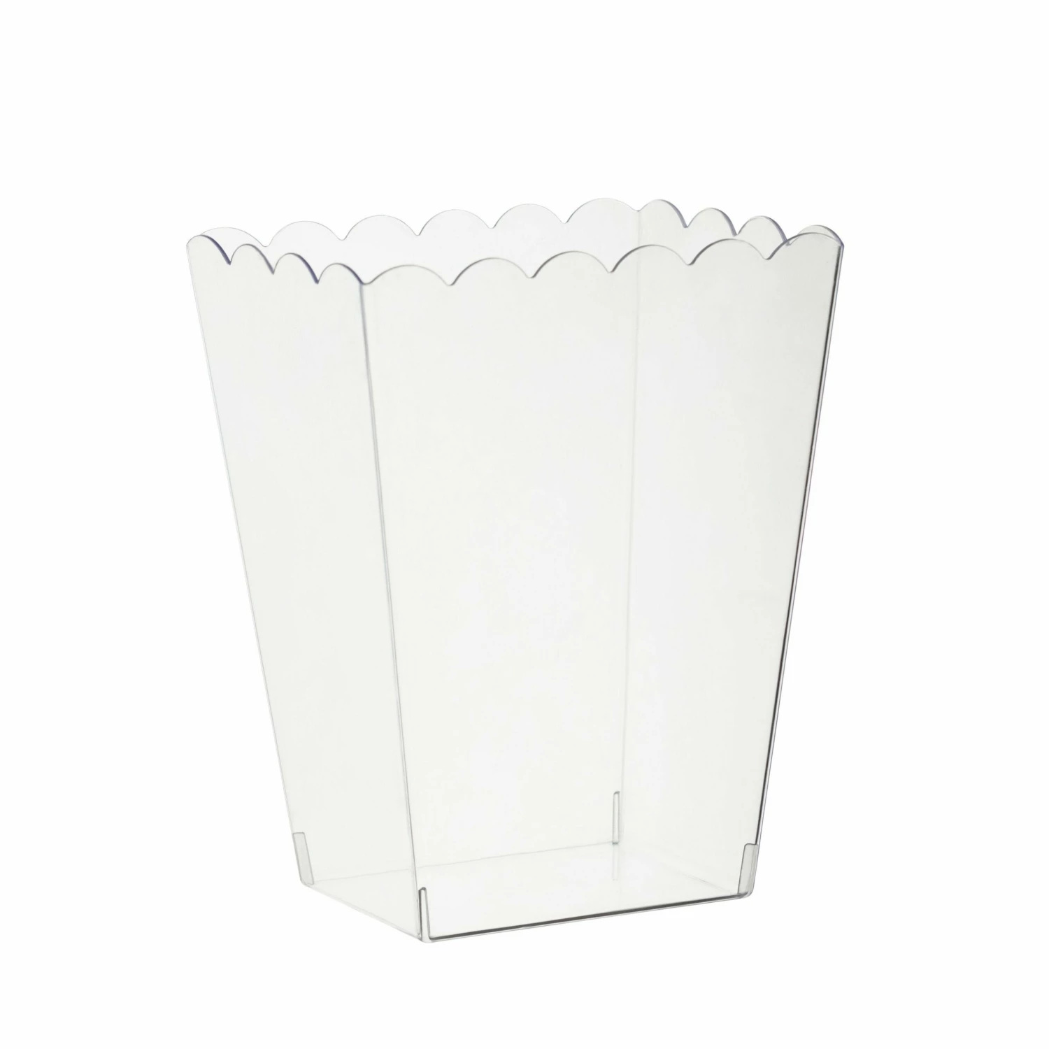 These clear, scalloped plastic popcorn containers are great for center table serving for popcorn, snacks, nuts and other delicacies. They are temperature-safe, making it suitable for hot and cold foods of all types.