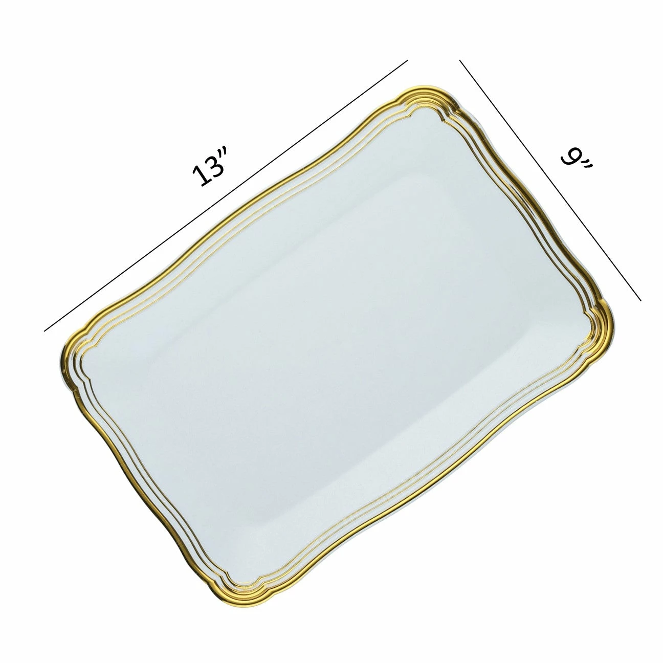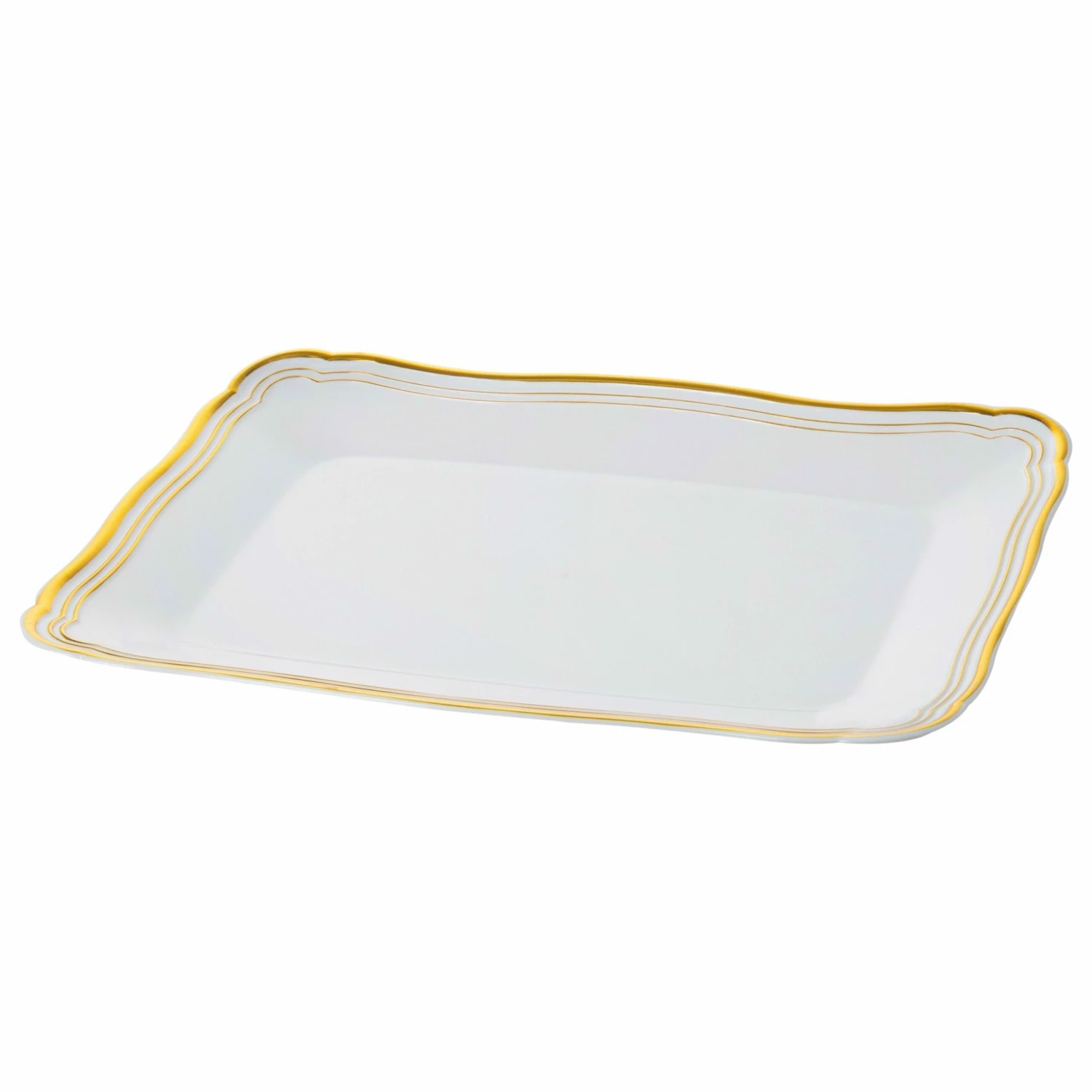 Serve appetizers and snacks to guests with this gold rimmed rectangular white serving tray.Β Great for catering formal events and hosting family reunions. The perfect decorative tray and party platter for use at weddings, holiday parties, dinners, baby showers, or any catered events.