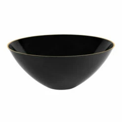 These sturdy black and gold plastic bowls are great for center table servings such as salads, snacks, pasta, and other delicacies.Β