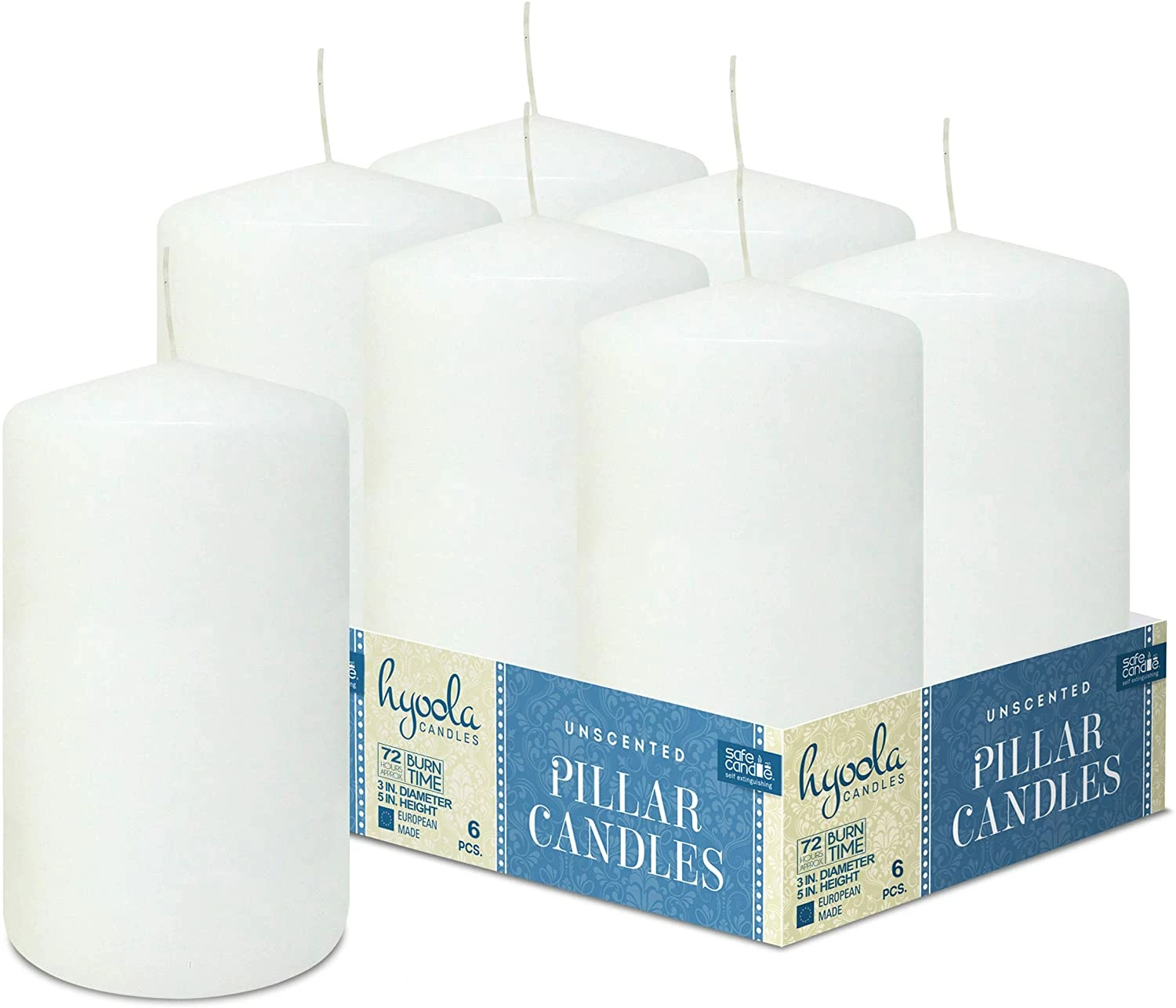 - SIZE: 3.1 inch diameter x 5 inch height (80mm x 127mm). PACK: 6-pack. COLOR: Stark white. BURN TIME: 72-hour burn time. FITS: Standard pillar candle holders. WICK: Smokeless, 100% cotton lead-free wicks.