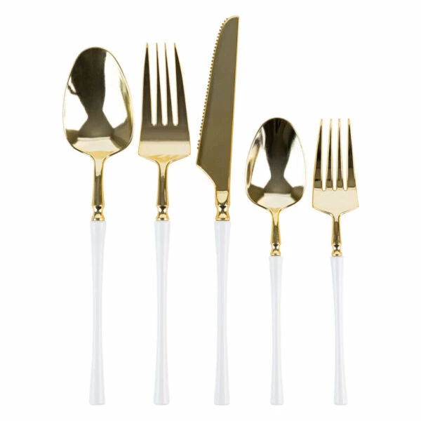 This beautiful and modern white and gold plastic silverware set is composed of high-rated heavyweight plastic materials rendering it strong enough for every type of food you might be serving. These flatware are 100% food grade and safe to use for a fine dining experience.