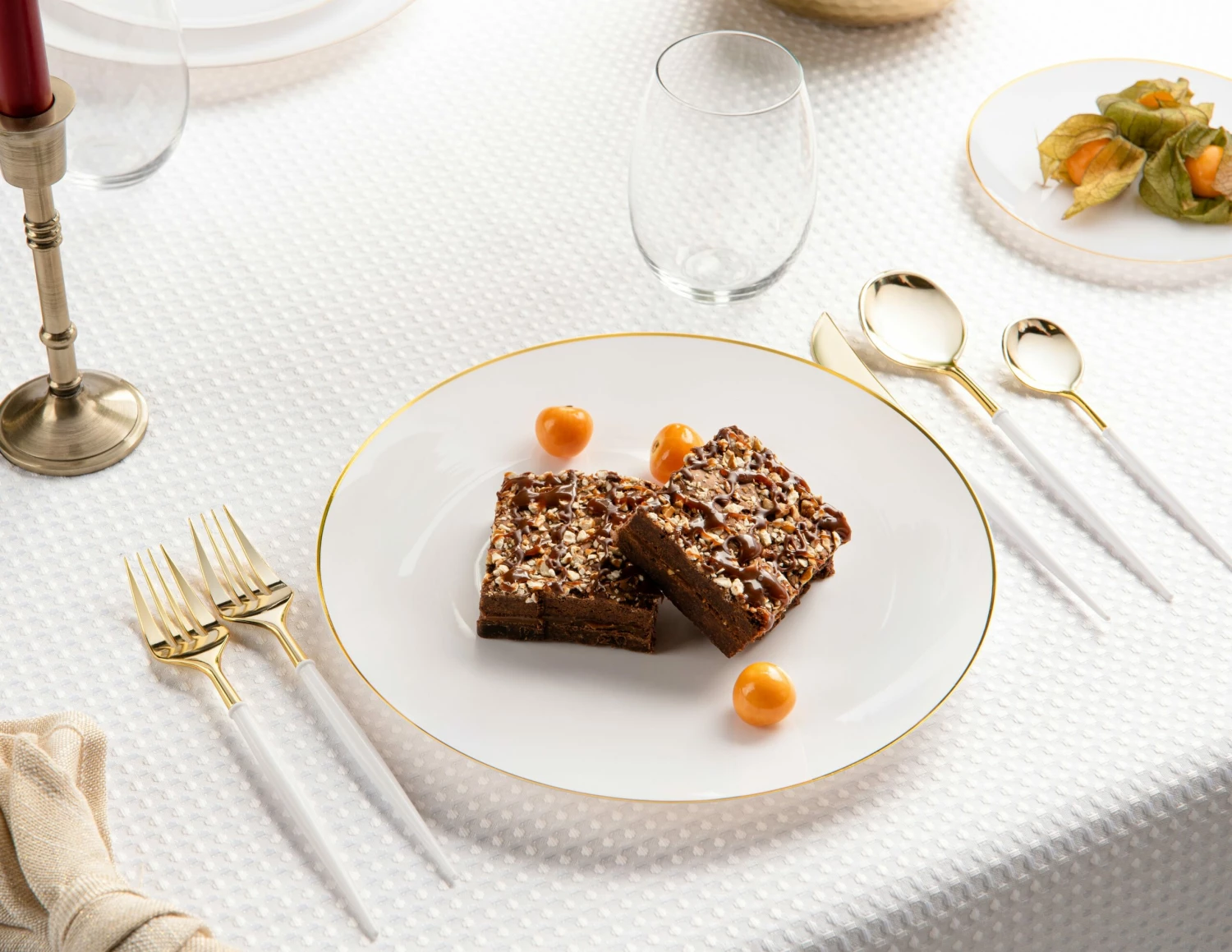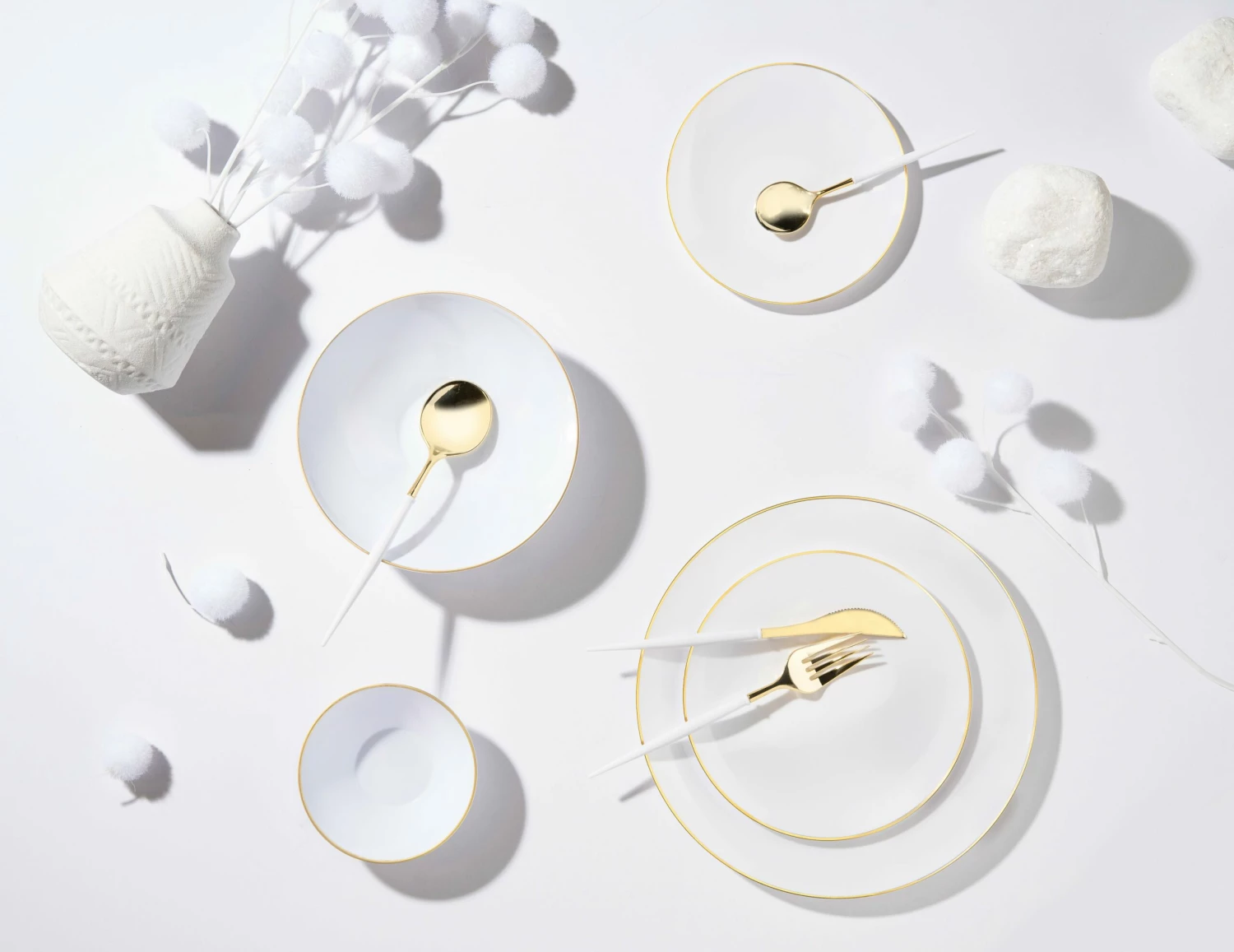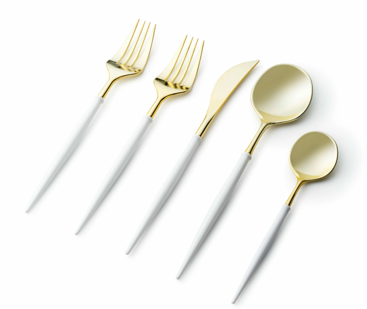 This beautiful and modern gold and white plastic silverware set is composed of high-rated heavyweight plastic materials rendering it strong enough for every type of food you might be serving. These flatware are 100% food grade and safe to use for a fine dining experience.