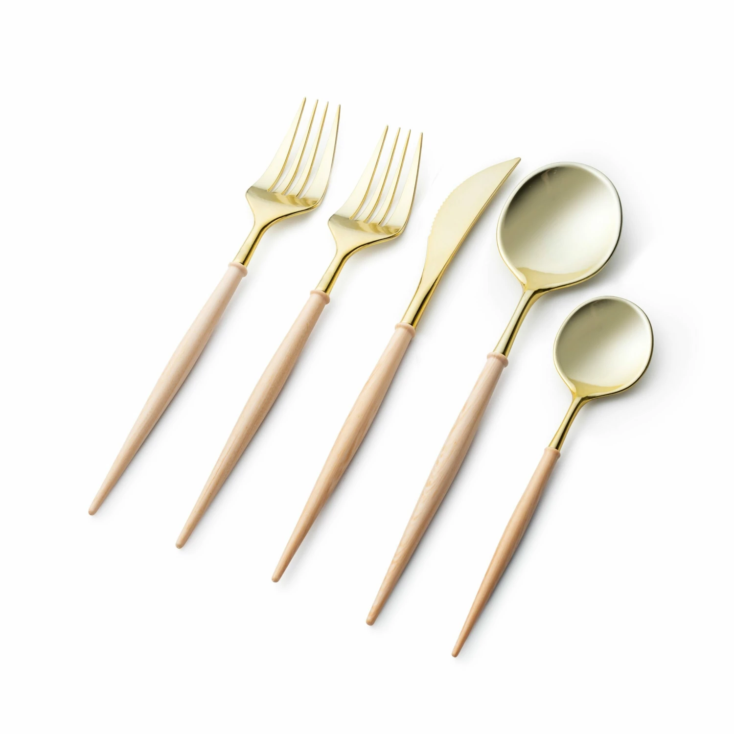 This beautiful and modern gold and wood cream plastic silverware set is composed of high-rated heavyweight plastic materials rendering it strong enough for every type of food you might be serving. These flatware are 100% food grade and safe to use for a fine dining experience.