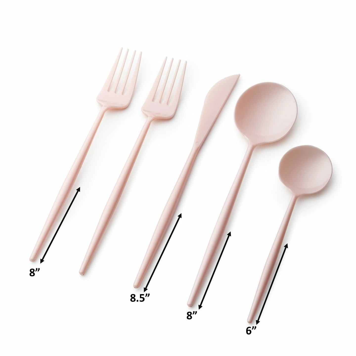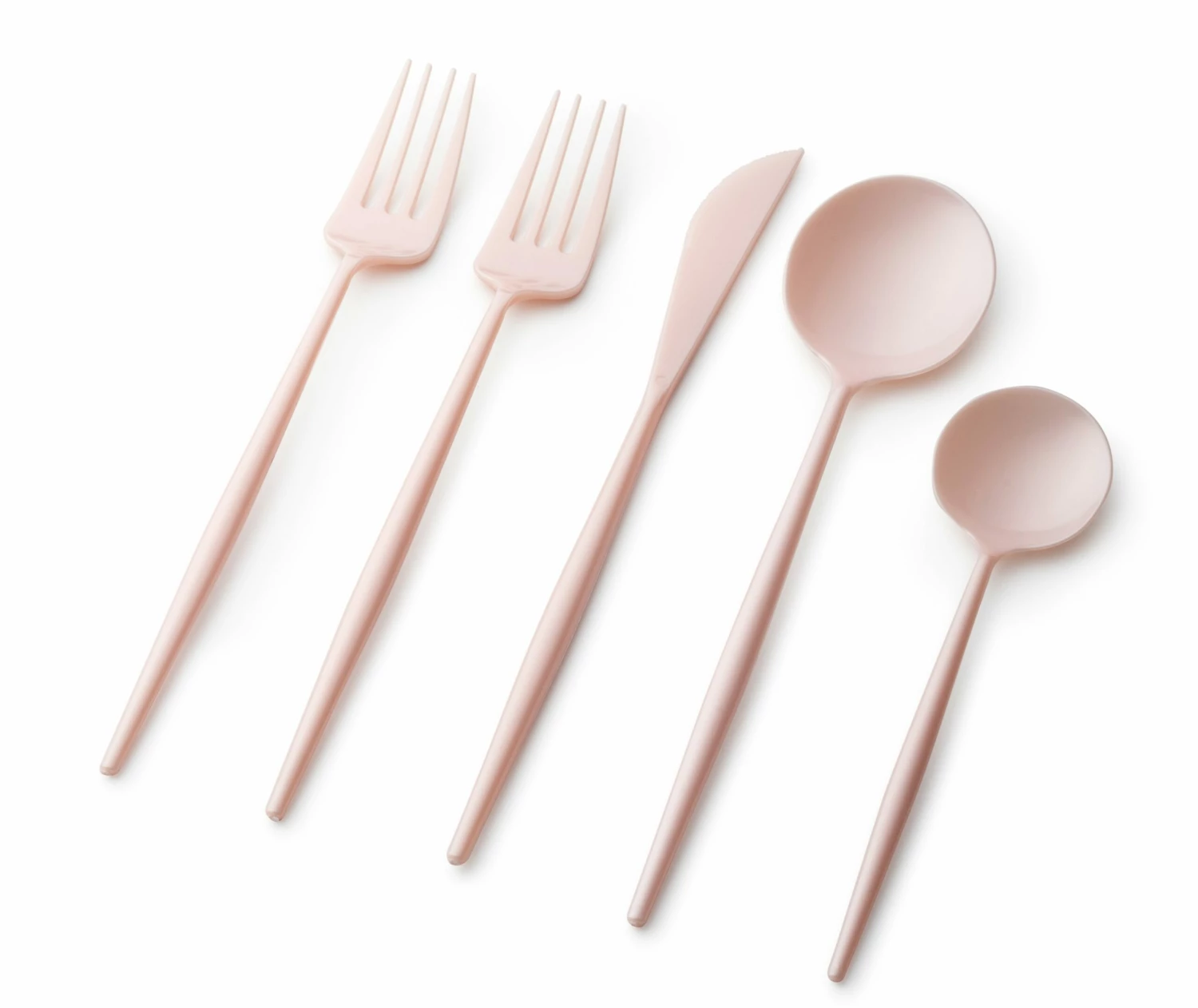 This beautiful and modern pearl pink plastic silverware set is composed of high-rated heavyweight plastic materials rendering it strong enough for every type of food you might be serving. These flatware are 100% food grade and safe to use for a fine dining experience.