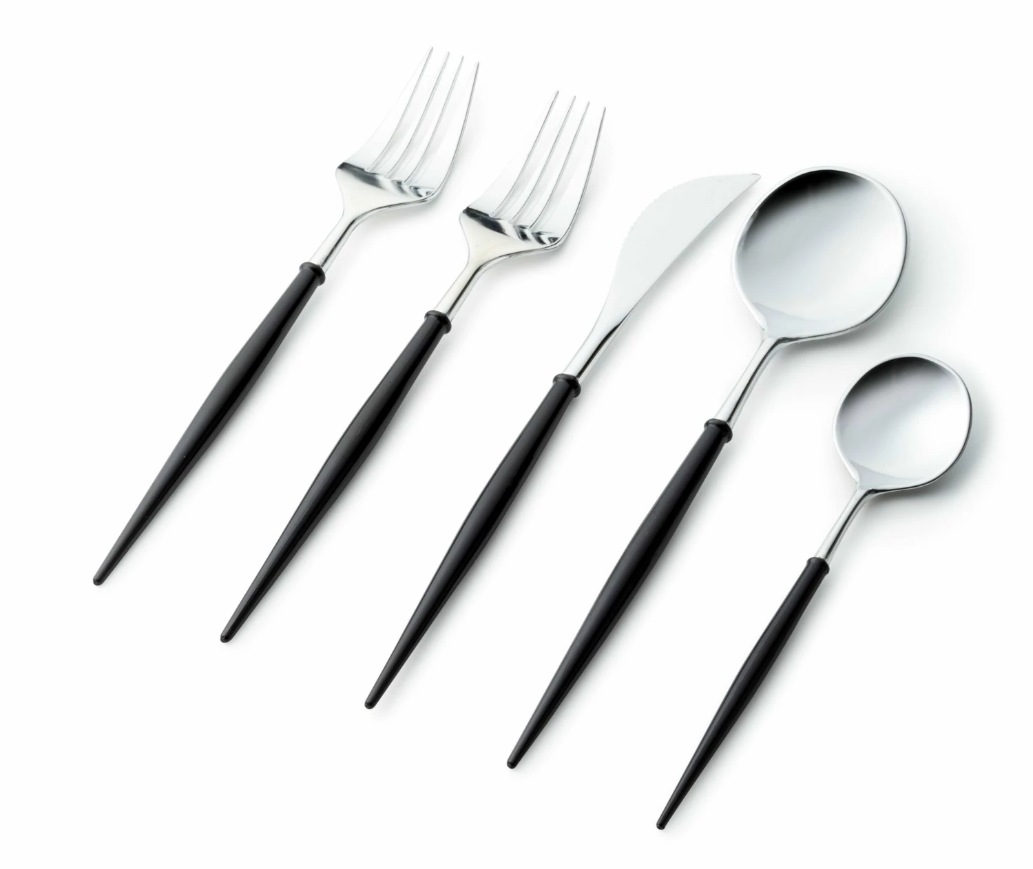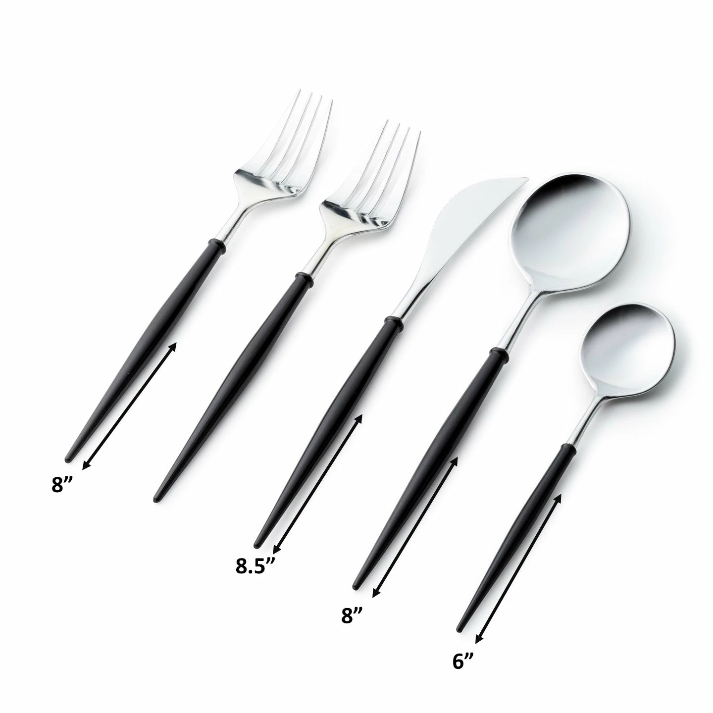 This beautiful and modern silver and black plastic silverware set is composed of high-rated heavyweight plastic materials rendering it strong enough for every type of food you might be serving. These flatware are 100% food grade and safe to use for a fine dining experience.