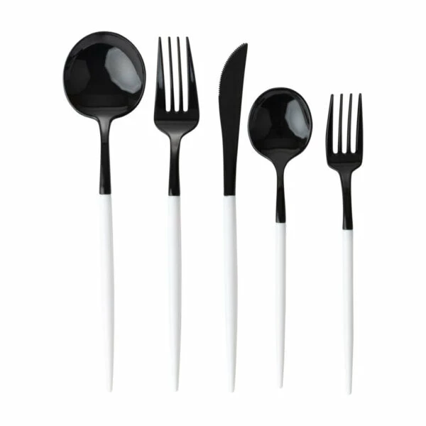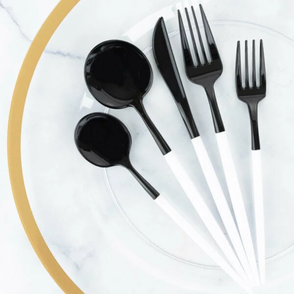 This beautiful andย modernย black and white plastic silverware set is composed of high-rated heavyweight plastic materials rendering it strong enough for every type of food you might be serving. These flatware are 100% food grade and safe to use for a fine dining experience.