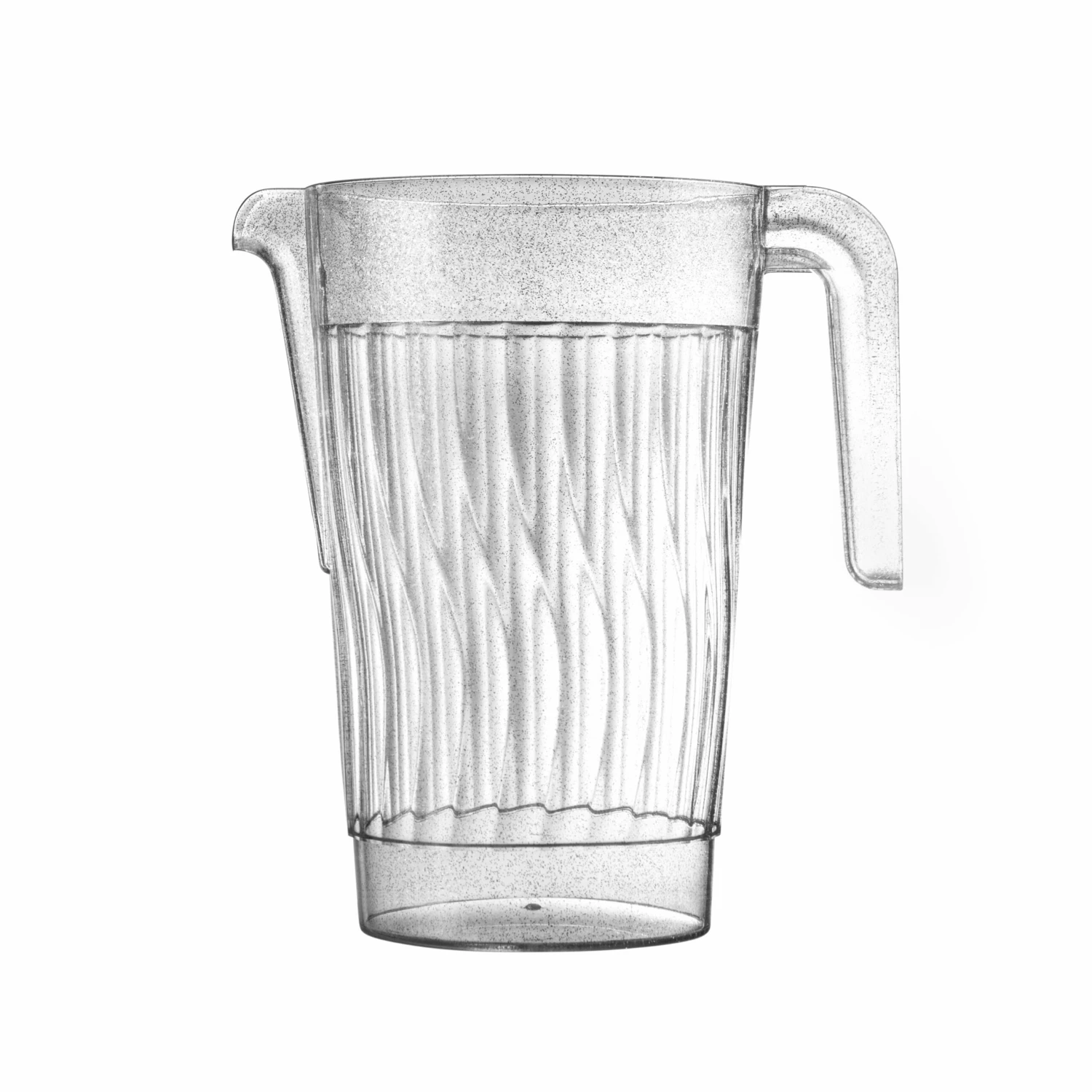 This clear pitcher is 7.67″ in height with a base diameter of 3.35″ and a 48-oz. capacity. It is made of polycarbonate for resistance to impact, grease, oil, detergent, and most inorganic acids. It has an ice trap at the spout for retaining ice or beer foam when pouring.