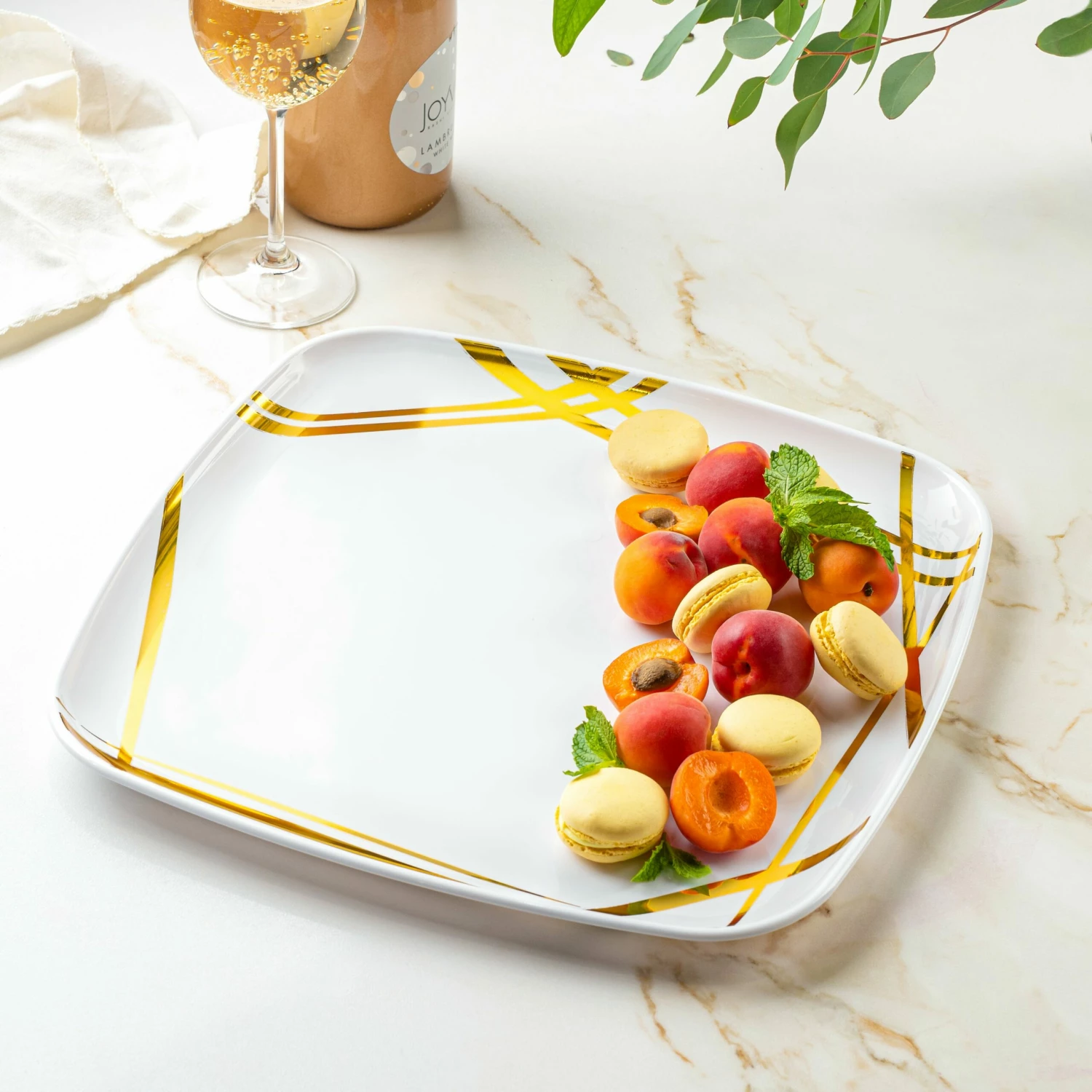 Serve appetizers and snacks to guests with this white and gold square serving tray. Great for catering formal events and hosting family reunions. The perfect decorative tray and party platter for use at weddings, holiday parties, dinners, baby showers, or any catered events.