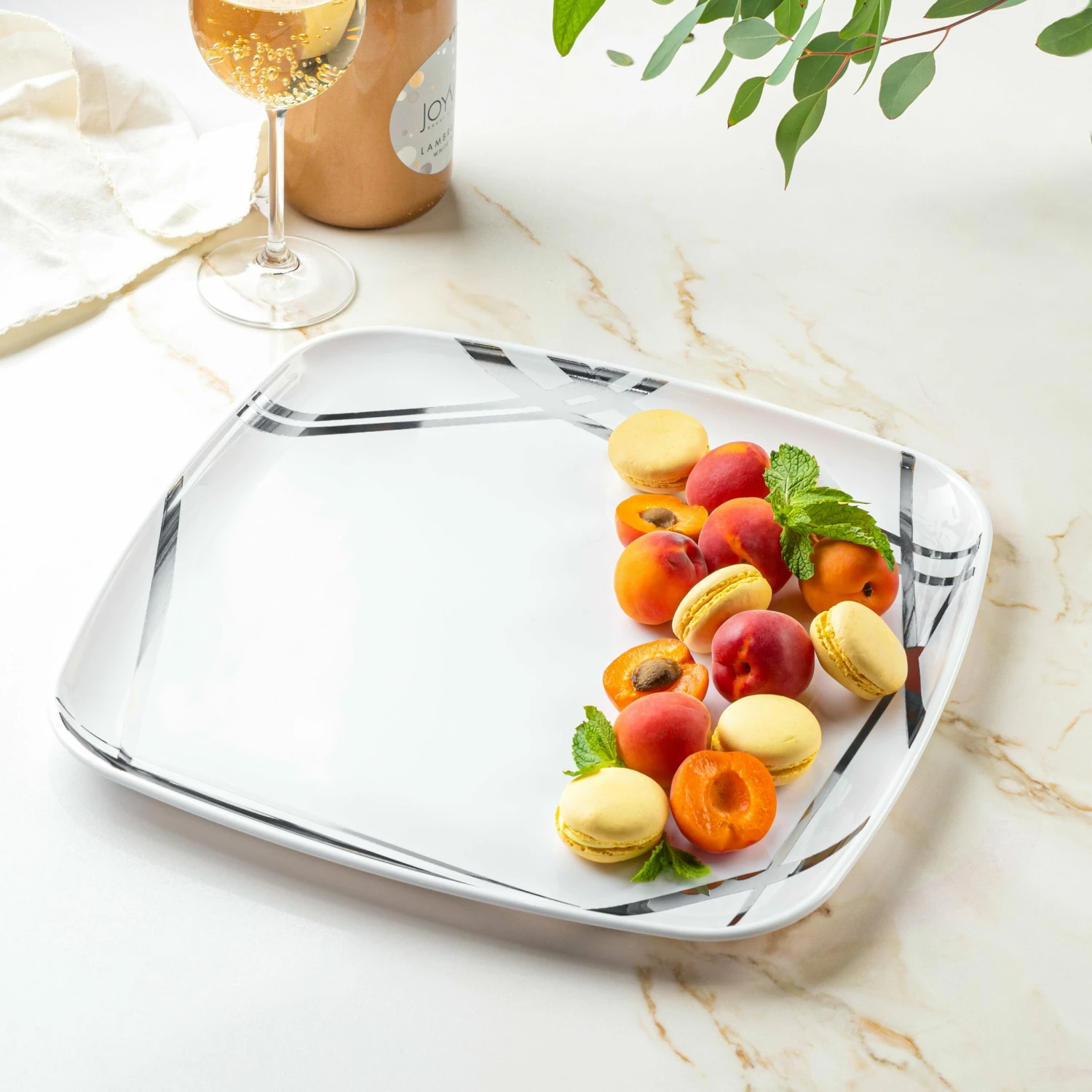 Serve appetizers and snacks to guests with this white and silver square serving tray. Great for catering formal events and hosting family reunions. The perfect decorative tray and party platter for use at weddings, holiday parties, dinners, baby showers, or any catered events.