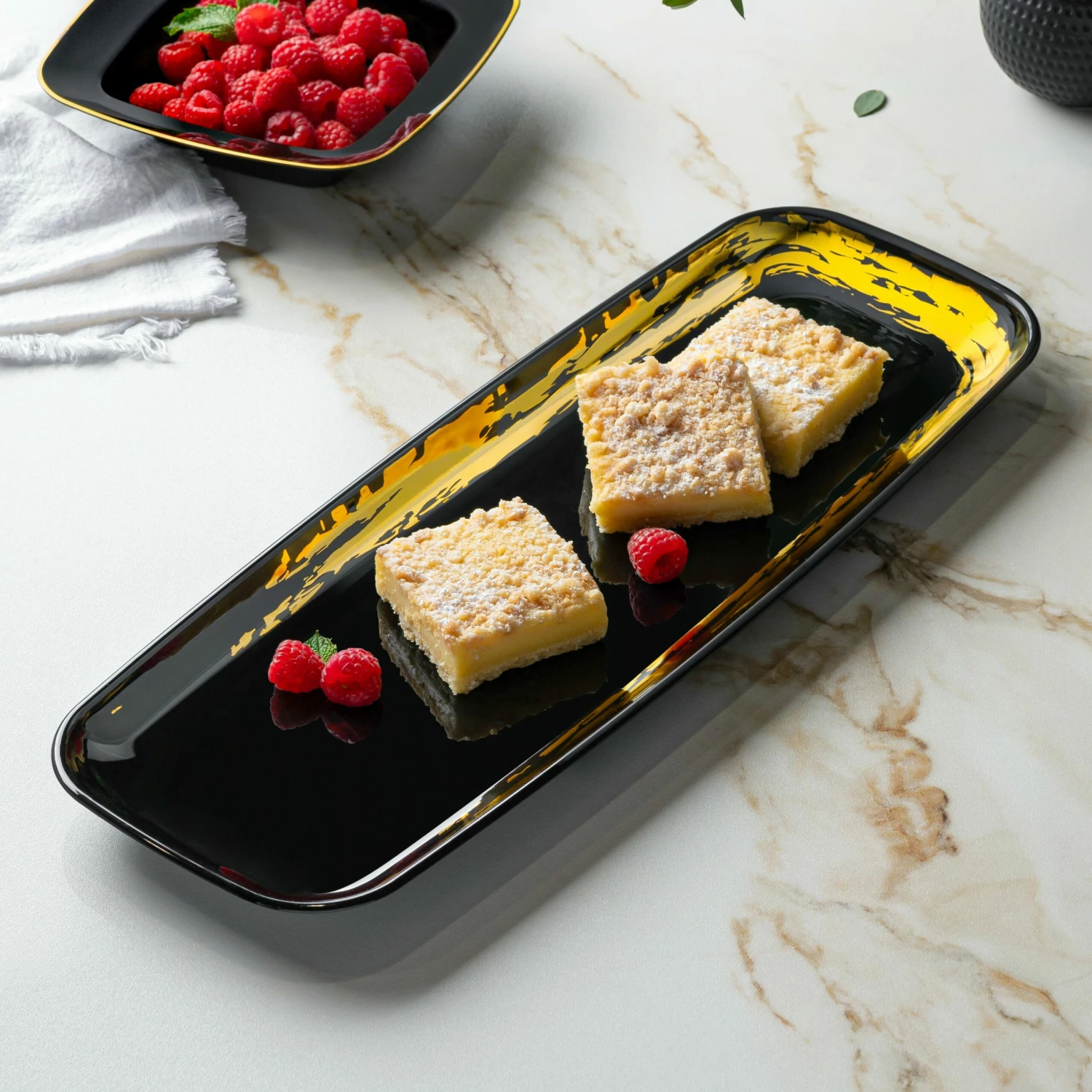 Serve appetizers and snacks to guests with thisΒ black andΒ gold oval serving tray.Β GreatΒ for catering formal events and hosting family reunions. The perfect decorative tray and party platter for use at weddings, holiday parties, dinners, baby showers, or any catered events.