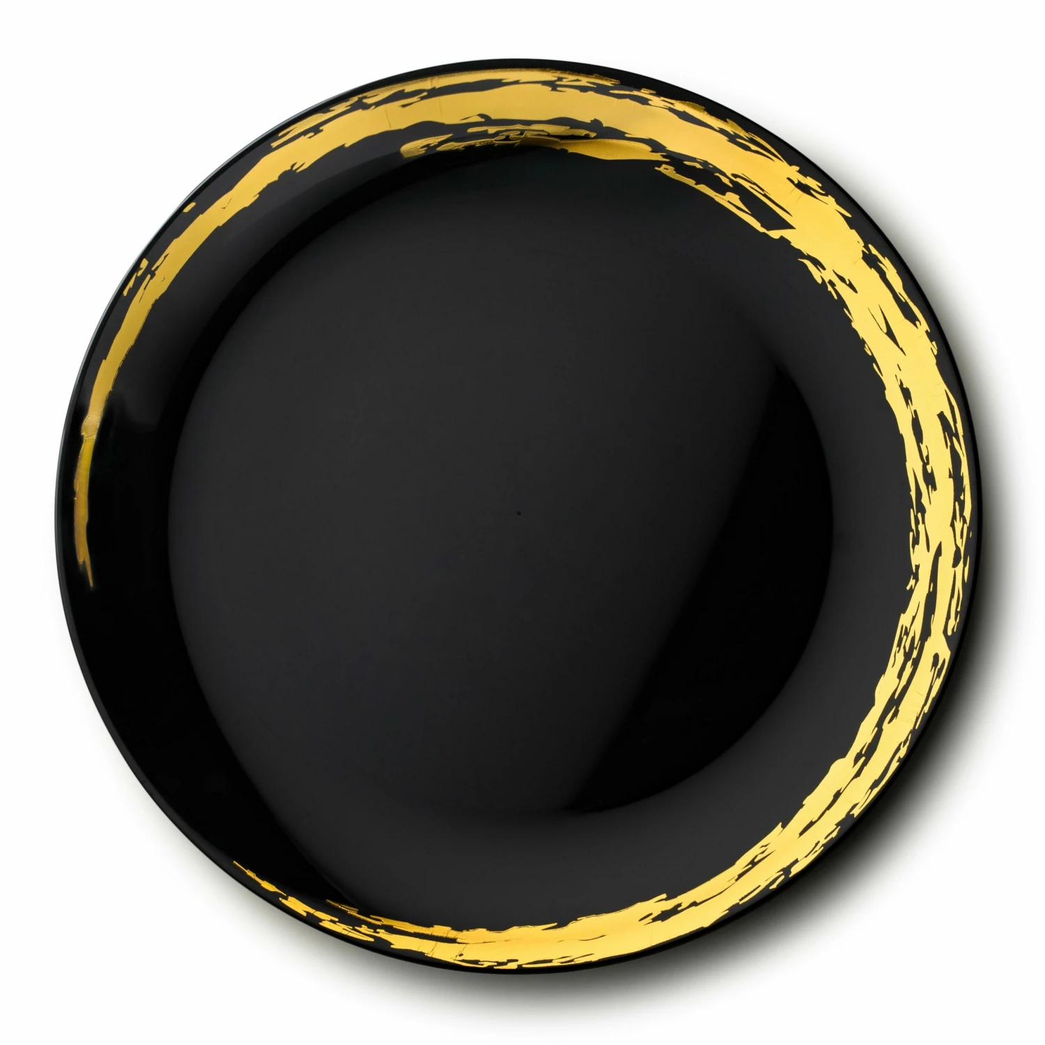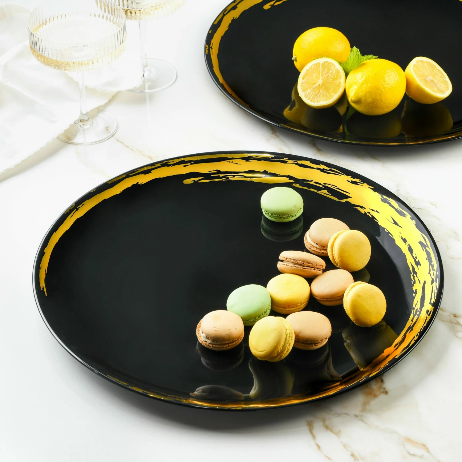 Serve appetizers and snacks to guests with this black and gold round serving tray. Great for catering formal events and hosting family reunions. The perfect decorative tray and party platter for use at weddings, holiday parties, dinners, baby showers, or any catered events.