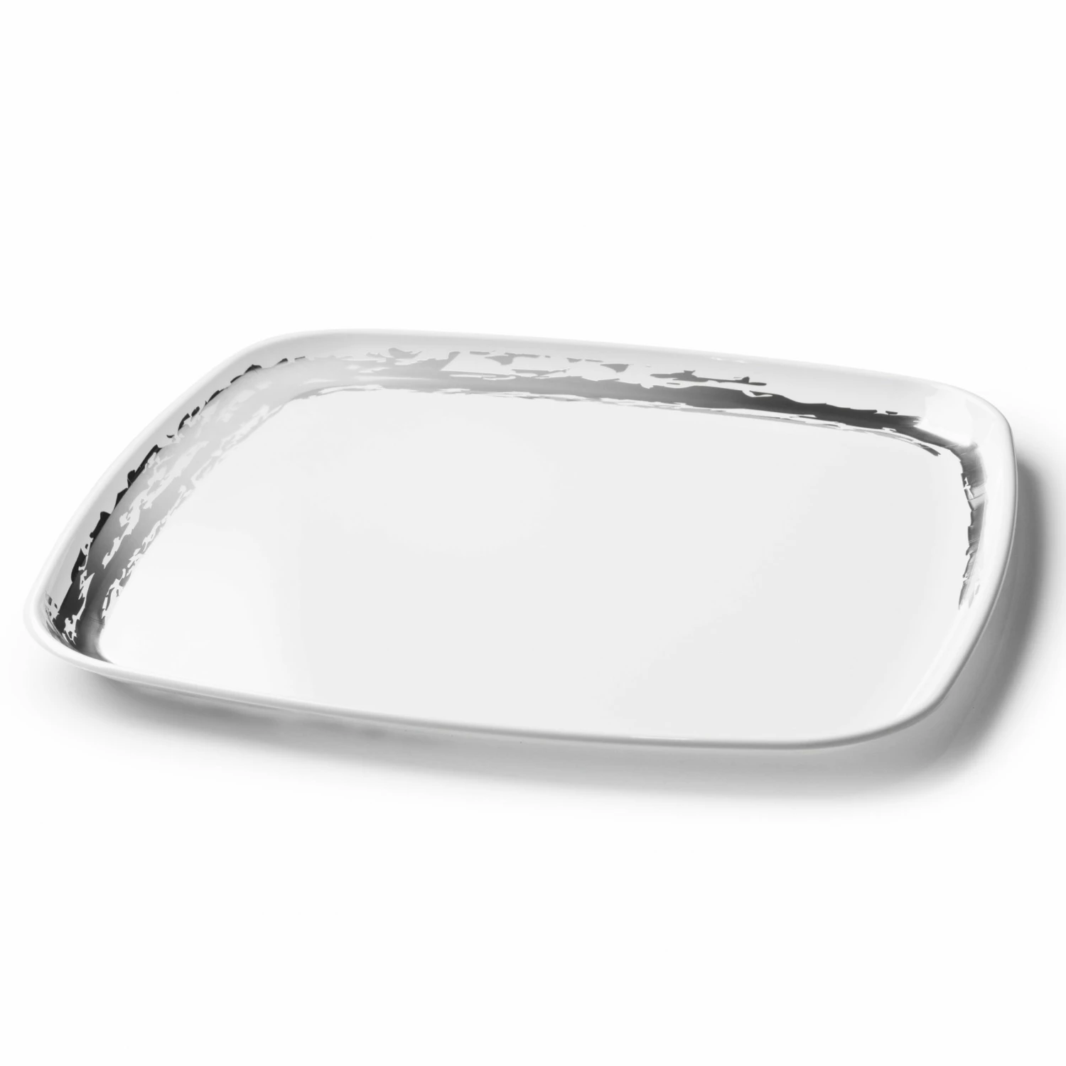 Serve appetizers and snacks to guests with this white and silver square serving tray. Great for catering formal events and hosting family reunions. The perfect decorative tray and party platter for use at weddings, holiday parties, dinners, baby showers, or any catered events.