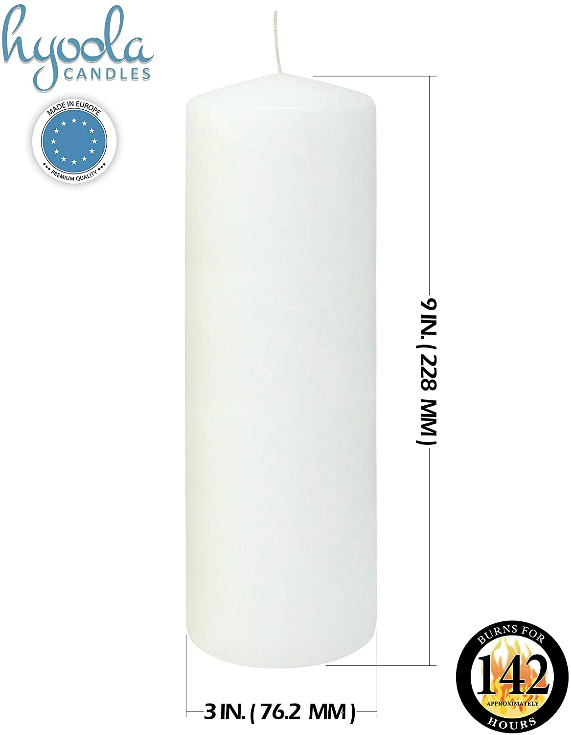 - SIZE: 3.1 inch diameter x 9 inch height (80mm x 228mm). PACK: 4-pack. COLOR: Stark white. BURN TIME: 142-hour burn time. WICK: Smokeless, 100% cotton lead-free wicks. Unscented candles pillar.